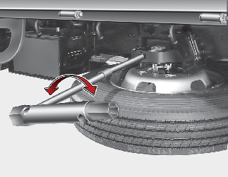 Faire tourner la clé de l'écrou de roue (ou la manivelle) dans le sens antihoraire pour libérer la roue de secours.