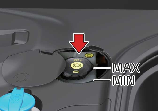 Periodically check that the fluid level in the brake fluid reservoir is between MIN and MAX. The level will fall as the vehicle's mileage increases. This is a normal condition associated with the wear of the brake linings.