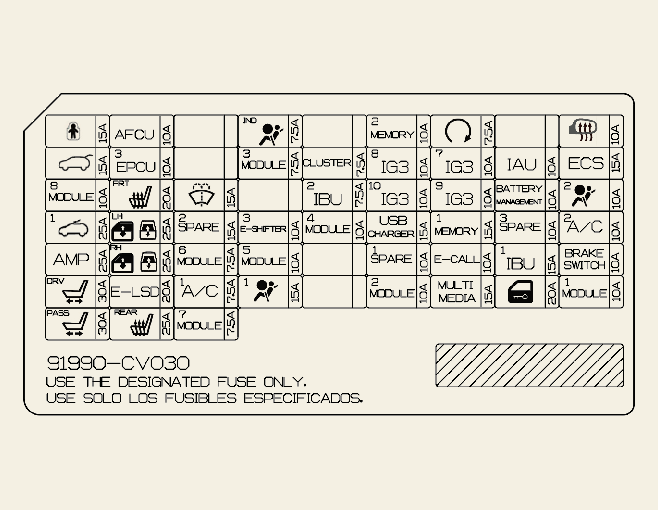 Stik til datalink, elektrokromisk spejl, E-CALL-enhed, ADP, Audio/Video- & navigations-hovedenhed, kollisionspudekontakt, forlygte LH/RH, AMP (forstærker), trådløs telefonoplader, elbetjent fører-/passagersædemodul, kontrolmodul for sædeventilation i forsæde, kontrolmodul for forsædevarmer/bagsædevarmer, konsolgulvkontakt, automatisk modul til nivellering af forlygte, IFS (Intelligent frontlyssystem)-modul |
