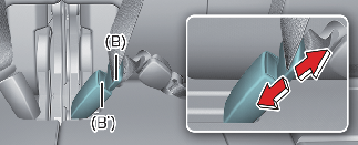 Retirer la languette (B) de la pochette. Tirer la languette (B) et l'introduire dans la boucle (B’) jusqu'à entendre un déclic, indiquant que le loquet est verrouillé. S'assurer que la ceinture n'est pas vrillée.