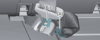 Pour enrouler la ceinture de sécurité centrale arrière, introduire la languette dans l'orifice de libération de la sangle (A'). Tirer vers le haut la sangle de la ceinture de sécurité et laisser la sangle s'enrouler automatiquement. Introduire la languette (A) dans l'orifice sur le couvercle de l'ensemble de ceinture de sécurité.