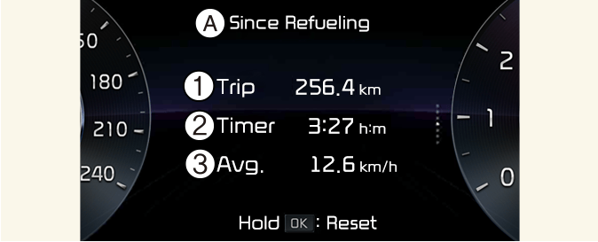 Pour remettre à zéro manuellement la consommation moyenne de carburant, appuyer sur le bouton OK au volant pendant plus de 1 seconde lorsque le consommation moyenne de carburant est affichée.