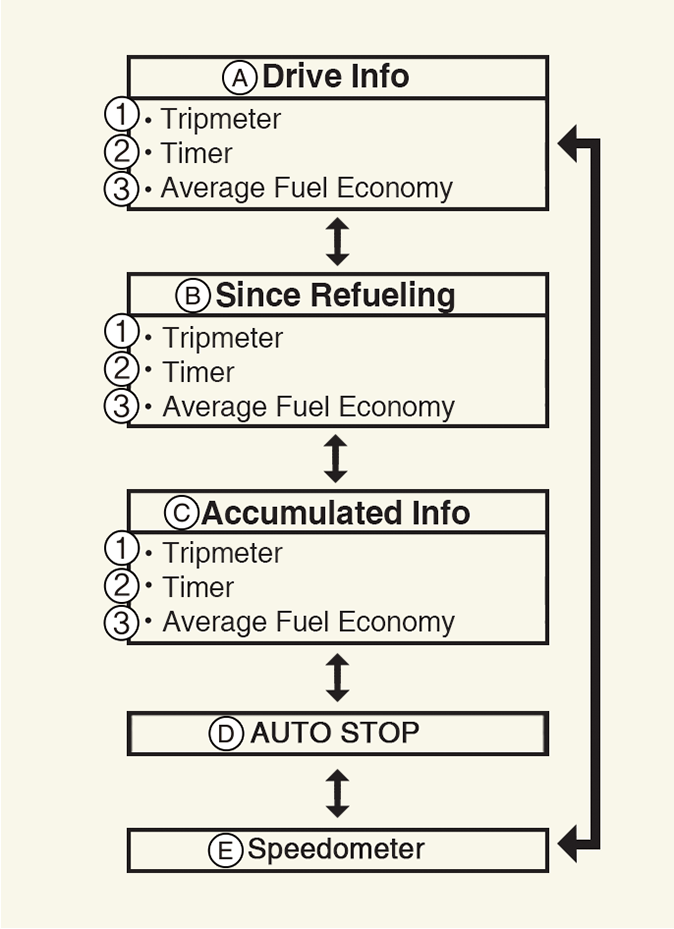 Cet affichage indique la distance du trajet (1), le rendement moyen du carburant (2) et la durée totale du trajet (3) une fois par cycle d'allumage.