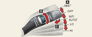 MIST : Pour un cycle de balayage unique, déplacez le levier sur cette position (MIST) et relâchez-le. Les essuie-glaces fonctionnent en continu si le levier est maintenu dans cette position.