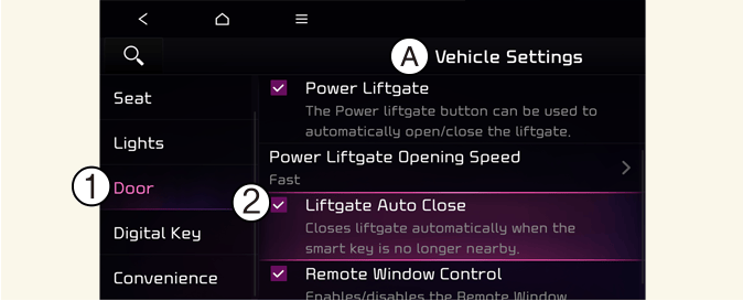 Avec le véhicule en marche, sélectionnez « Configuration → Paramètres du véhicule → Porte / passager → Fermeture automatique du hayon électrique » pour activer la fermeture automatique du hayon électrique et désélectionnez-la pour désactiver la fonction dans le système d'infodivertissement.