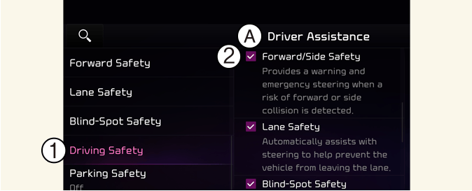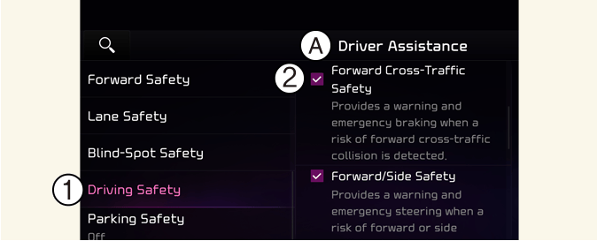 Avec le véhicule en marche, appuyez sur Paramètres → Véhicule → Aide à la conduite → Sécurité de la conduite à partir de l'écran du système d'infodivertissement pour définir l'utilisation ou non de chaque fonction.
