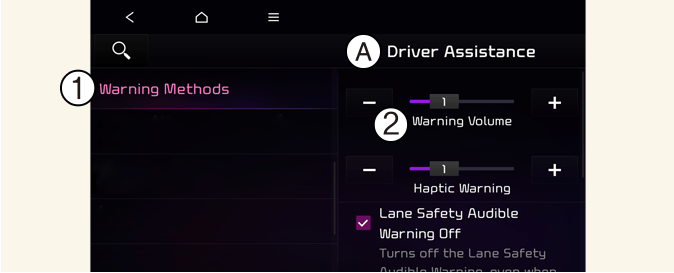 Assurez-vous que le volume d’avertissement sonore et haptique que vous avez réglé peut s’appliquer au volume d’avertissement d’autres systèmes d’assistance à la conduite.