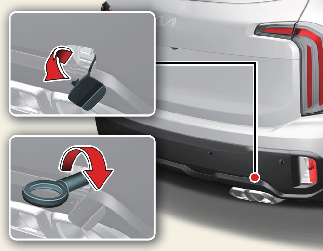 Retirez le cache de l’orifice en appuyant sur la partie supérieure la cache sur le pare-chocs avant. Installez le crochet d'attelage en le tournant dans le sens des aiguilles d'une montre dans le trou jusqu'à ce qu'il soit complètement fixé.