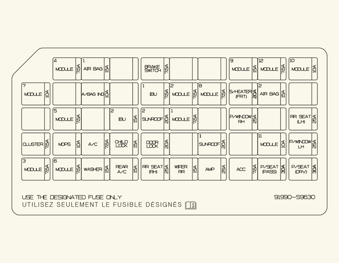 Toutes les descriptions du panneau à fusibles dans ce manuel ne s'appliquent pas à votre véhicule. Il est exact au moment de l'impression. Lorsque vous inspectez le panneau à fusibles de votre véhicule, reportez-vous à l'étiquette du panneau à fusibles.