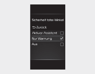 Wenn Sie die Einstellung von „Aus“ auf „Nur Warnung“ ändern, blinkt die Warnleuchte am Außenrückspiegel drei Sekunden lang.