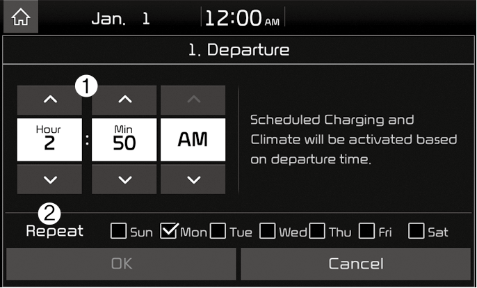 Az indulási időt az 'EV → Töltéskezelés → Időzített töltés és klímaszabályozás → Következő indulás ideje →' menüpont kiválasztásával lehet beállítani.