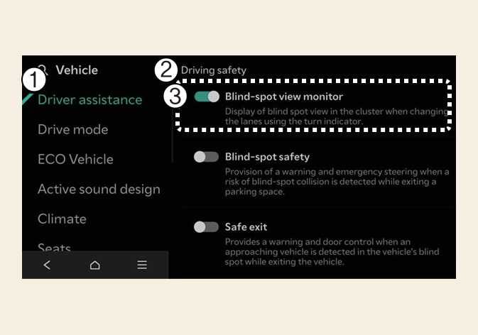 Kun auto on käynnissä, voit kytkeä sokean pisteen näytön päälle valitsemalla tietoviihdejärjestelmässä , ja kytkeä järjestelmän pois päältä poistamalla valinnan.