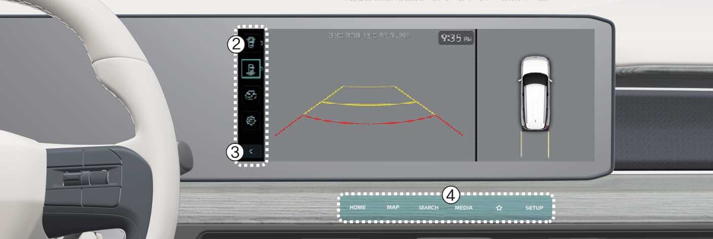 Painamalla näkymänvaihtopainiketta (2) takanäkymä näytössä voit valita takaylänäkymän, takanäkymän tai laajan takanäkymän.