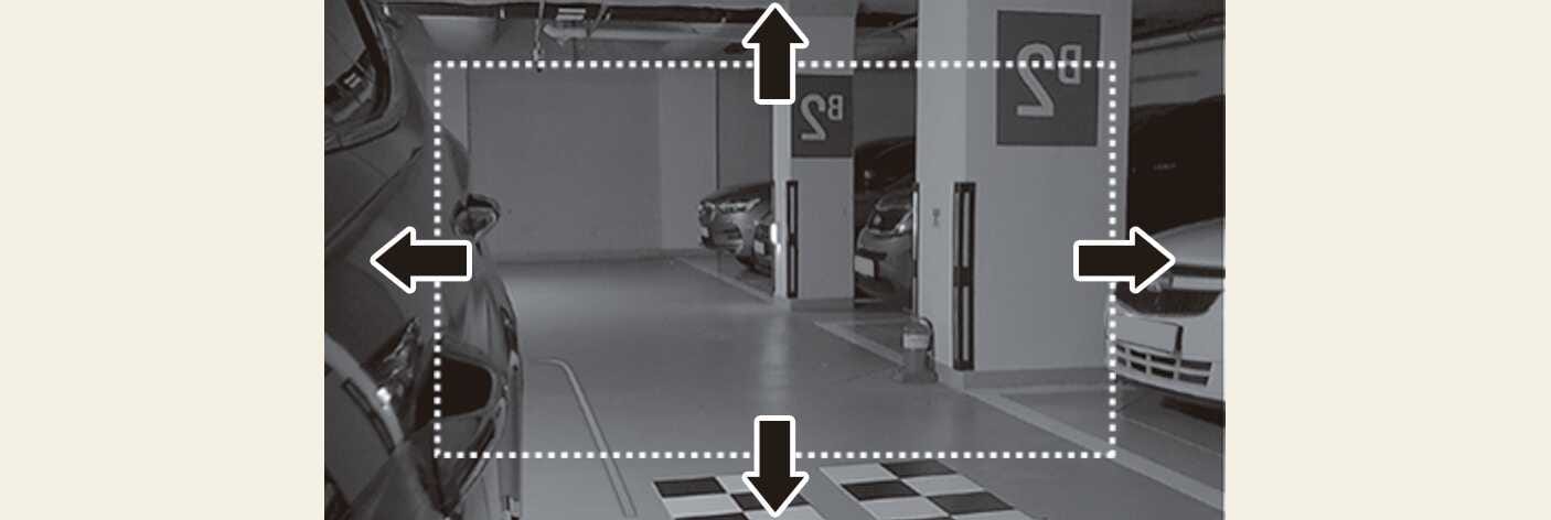 Kun vaihdat R (peruutus) -asentoon, molemmat DSM-monitorinäyttö voidaan asettaa vaihtamaan laajanäkymätilaan. Kun vaihdat laajanäkymätilaan, näytetään myös ohjausviiva, jonka avulla voit tarkistaa vieressäsi olevan ajoneuvon pysäköintilinjat ja sivu-/takapysäköintilinjat.