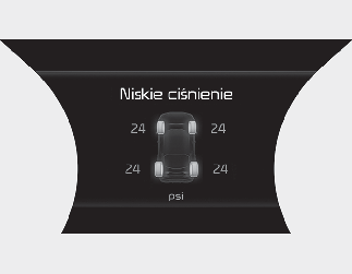 Zapalenie się wskaźników ostrzegawczych i pojawienie się na wyświetlaczu LCD zestawu wskaźników odpowiedniego komunikatu ostrzegawczego z systemu monitorowania ciśnienia w oponach oznacza, że w co najmniej jednej oponie wystąpił znaczny ubytek ciśnienia powietrza.