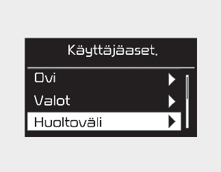 Voit nollata valikot käyttäjän asetukset -tilassa. Kaikki käyttäjän asetusten valikot nollautuvat tehdasasetuksiin, paitsi kielivalinta ja huoltoväli. |