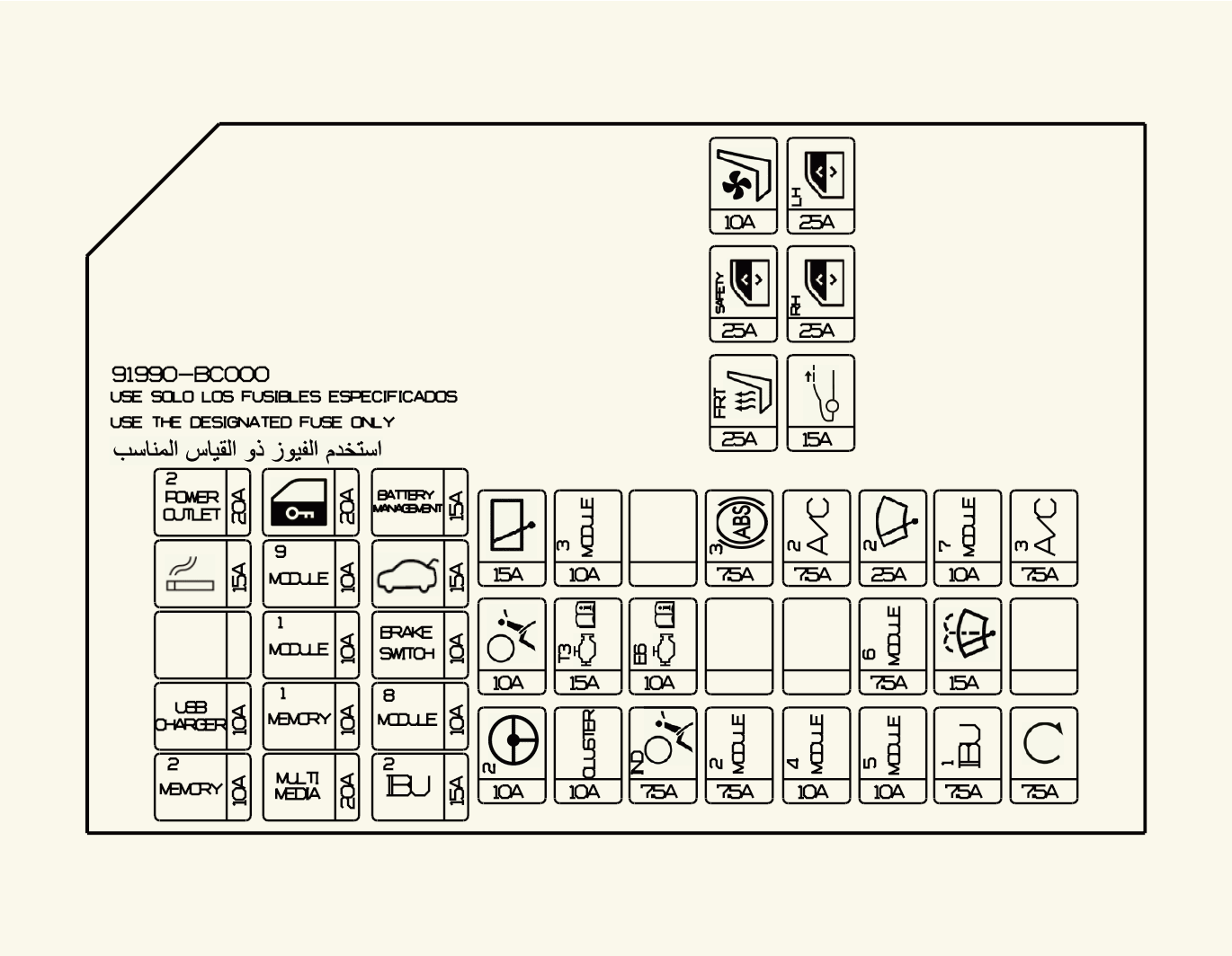 لا تنطبق جميع أوصاف لوحة المصاهر الواردة في هذا الدليل على سيارتك. وهي مطابقة في وقت الطباعة. عندما تفحص لوحة المصهر في سيارتك، ارجع إلى ملصق لوحة المصهر.