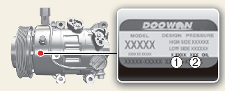 يعطيك الملصق الموجود على الضاغط معلومات حول نوع الضاغط الذي تم تزويد السيارة به، مثل الطراز، ورقم جزء المورد، ورقم الإنتاج، والمبرد (1) وزيت التبريد (2).