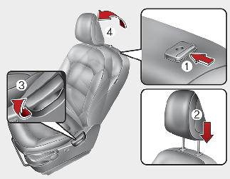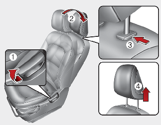 헤드레스트를 높이려면 헤드레스트를 잡고 잠기는 위치까지 위로 당겨 올리십시오(1). 헤드 레스트를 낮추려면, 잠금해제 버튼(2)을 누른 상태에서 헤드레스트를 위에서 누르십시오(3). 헤드레스트의 높이는 헤드레스트의 중심 부분과 승객의 귀 상단이 일치하도록 조절하십시오.