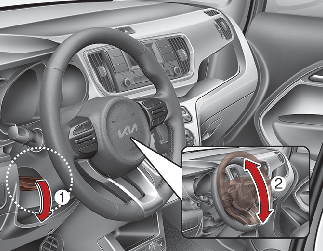 높이를 조절할 때는 조절 레버를 아래로 밀어 내린 상태(1)에서 스티어링 휠을 상·하(2)로 움직여 위치를 결정합니다. 조절 후에는 조절 레버를 원위치시킨 다음 스티어링 휠을 흔들어 확실하게 고정되었는지 확인하십시오.
