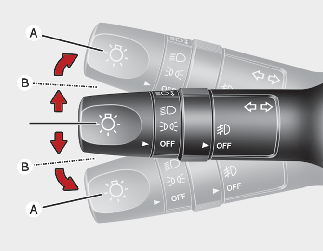 차량의 이동 방향을 예고하기 위해 사용하십시오. 우측 방향을 표시하려면 조명 스위치를 위로, 좌측 방향을 표시하려면 아래로 움직이십시오.(A) 방향전환이 완료되면 자동으로 작동이 취소됩니다. 만일, 자동으로 작동이 취소되지 않으면 스위치를 중앙으로 놓으십시오.