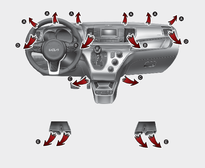 주로 발끝으로 바람이 나오게 할 때 사용합니다. (일반적으로 난방을 할 때의 위치입니다.) 앞유리 습기 발생 예방 차원에서 (ⓐ), (ⓓ)방향에서도 약간의 바람이 나옵 니다. |