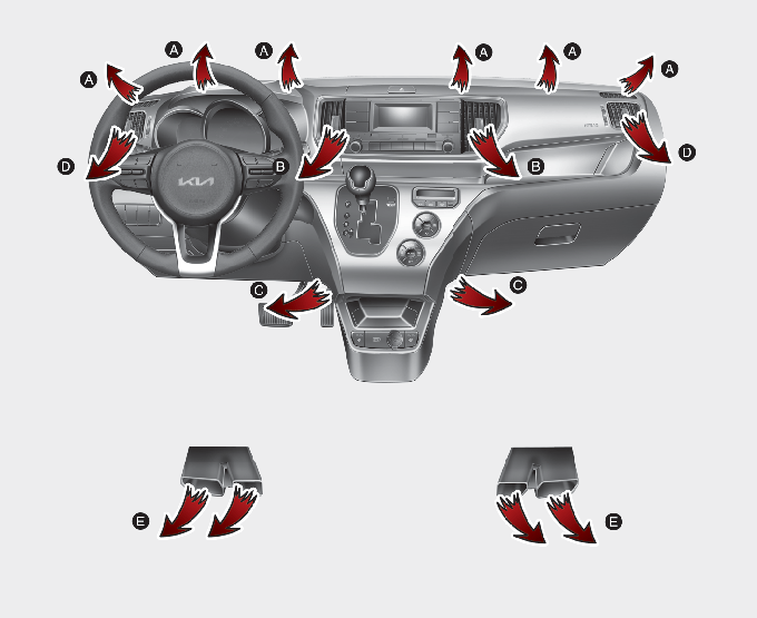 상반신, 얼굴쪽으로 바람이 나옵니다. (일반적으로 냉방을 할 때의 위치입니다.) 운전자의 냉/난방 쾌적성을 위해 발끝에서도 약간의 바람이 나옵니다. |