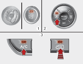 내/외 공기 선택(실내 순환) 버튼내의 표시등이 0.5초 간격으로 3회 깜빡이면 유리창 습기 방지 기능의 해제 또는 설정이 완료됩니다. 초기 배터리 연결시에는 자동 설정 기능으로 초기화 됩니다.