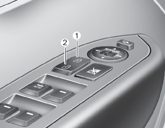 운전석에 있는 중앙 도어 잠금 스위치 (1)을 누르면 모든 도어가 잠기고 (2)를 누르면 모든 도어가 잠금 해제됩니다.