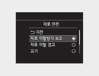시동 「ON」 상태에서 계기판 「사용자 설정 → 운전자 보조 → 차로 안전」에서 기능을 선택할 수 있습니다. 또한 끄기를 선택하여 기능을 해제할 수 있습니다.