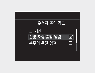 시동 「ON」 상태에서 클러스터의 사용자 설정 모드의 「운전자 보조 → 운전자 주의 경고 → 전방 차량 출발 알림」 을 선택하면 기능이 켜지고 작동합니다.