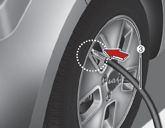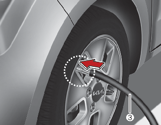 손상된 타이어의 휠 공기 주입구 캡을 풀어 「실런트 주입 호스」(3)를 휠 공기 주입구에 연결하여 고정하십시오.