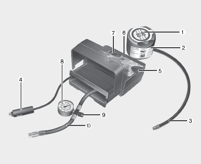 실런트 주입을 위해 컴프레서 스위치(7)를 눌러 약 5~7분 정도 작동하여 적정 타이어 공기압( 자세한 내용 참고)이 되도록 실런트를 주입하십시오. 타이어 공기압은 나중에 다시 확인 및 재조정 하십시오.