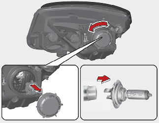 엔진 후드를 열고 전조등 뒤편에 있는 커버를 시계반대방향으로 분리하십시오.