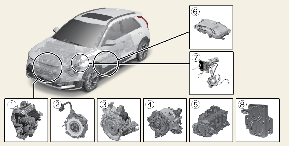 Az emberek áramütés elleni védelme érdekében a jármű nagyfeszültségű alkatrészei narancssárga szigeteléssel és fedelekkel vannak ellátva. További figyelmeztetésként a rendszer néhány alkatrészére nagyfeszültségre figyelmeztető címkék vannak felragasztva. Javíttassa meg a járművet egy szakműhelyben. A Kia hivatalos Kia-kereskedő/szervizpartner felkeresését javasolja.