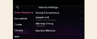 Válassza a Beállítás → Jármű → Vezetősegéd elemet az Infotainment rendszer képernyőjén a Vezetősegéd funkció beállításához.