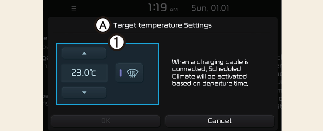 Set Target Temperature: If the target temperature (1) is set with the charger connected, the cabin temperature will be adjusted to the target temperature at departure time (without loss of high voltage battery charging level). In cold weather, pre-scheduled heating helps enhance electric vehicle performance by heating the vehicle in advance.