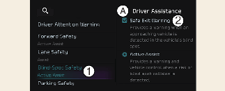 With the vehicle on, select Setup → Vehicle → Driver Assistance → Blind-Spot Safety→ Safe Exit Warning from the infotainment system screen to turn on Safe Exit Warning and deselect to turn off the function.