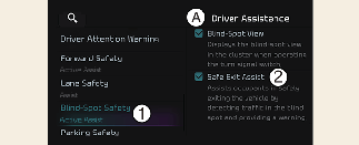 With the vehicle on, select Setup → Vehicle → Driver Assistance → Blind-Spot Safety → Safe Exit Assist from the infotainment system screen to turn on Safe Exit Assist and deselect to turn off Safe Exit Assist.