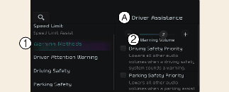 Warning Volume: Select Setup → Vehicle → Driver Assistance → Warning Methods on the Infotainment system.