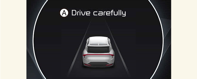 Varningsmeddelandet Kör försiktigt visas i klustret när systemet panikbromsar fordonet.