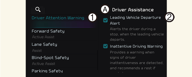 Med bilen igång aktiverar eller avaktiverar du Inställningar → Fordon → Förarassistans → DAW (uppmärksamhetsvarning) på infotainmentsystemets skärm för att ange om du vill eller inte vill använda respektive funktion.