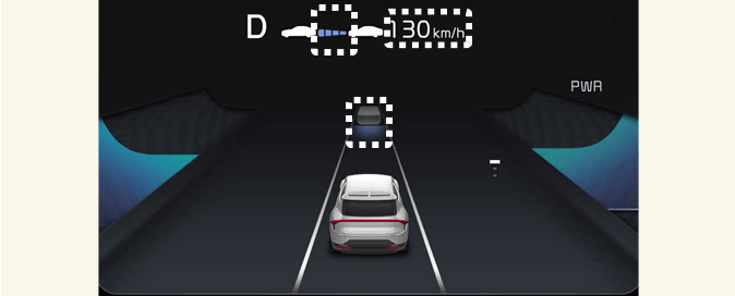 Det inställda avståndet och huruvida du har ett fordon framför dig visas.