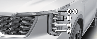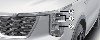 Если светодиодная передняя фара (1, 2), светодиодные габаритные и дневные ходовые огни (3), светодиодные указатели поворота (4,5) не работают, следует проверить автомобиль в специализированной мастерской. Kia рекомендует обратиться к официальному дилеру Kia или партнерской сервисной компании.