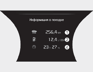 На этом дисплее отображается общее пройденное расстояние (1), средняя эффективность использования топлива (2), мгновенный расход топлива (3) и общее время поездки (4).