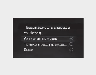 Если в меню настроек выбрать Off (Выкл.), вспомогательная система предотвращения лобового столкновения перестанет работать, и водителю следует быть внимательным и соблюдать правила безопасного управления автомобилем.