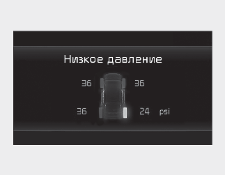 Если загораются индикаторы системы контроля давления в шинах, а на ЖК-дисплей приборной панели выводится предупреждающее сообщение, то в одной или нескольких шинах отмечается значительное падение давления. Сигнал положения шины с низким давлением указывает, в какой именно шине отмечается значительное падение давления с помощью включения соответствующей контрольной лампы.