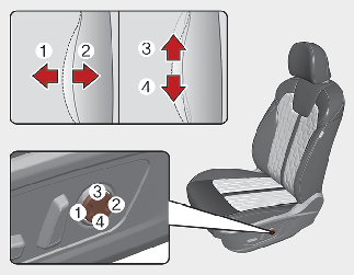 Pentru a înclina scaunul pasagerului din față înainte, apăsați comutatorul (3). Pentru a înclina scaunul pasagerului din față înapoi, apăsați comutatorul (4).