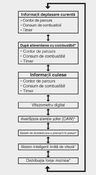 Acest afișaj indică distanța de deplasare cumulată, consumul mediu de combustibil și consumul instantaneu de combustibil (sau durata totală de deplasare) de la ultima alimentare cu combustibil.