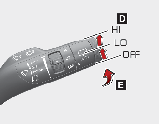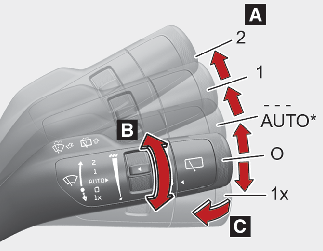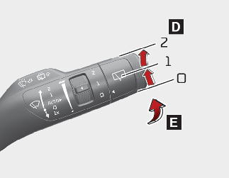 INT / ---: Ștergătorul funcționează intermitent la aceleași intervale de ștergere. Utilizați acest mod în caz de ploaie ușoară sau de ceață. Pentru a modifica setarea vitezei, rotiți butonul de reglare a vitezei.